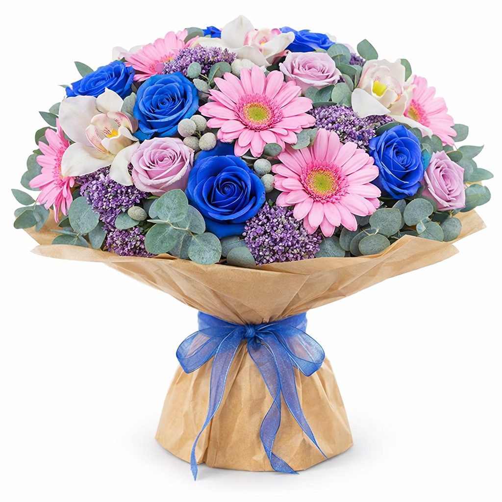 В этом букете яркие синие и сиреневые розы сочетаются с нежными розовыми герберами и белоснежными орхидеями, дополненные брунией, гипсофилой, озотамнусом и эвкалиптом. Композиция аккуратно завернута в крафт-бумагу и украшена яркой синей лентой, что придаёт ей свежий и утончённый вид. Она создаёт атмосферу радости и гармонии. Идеально подходит для романтического вечера для любимой женщины или для выражения благодарности учителю.