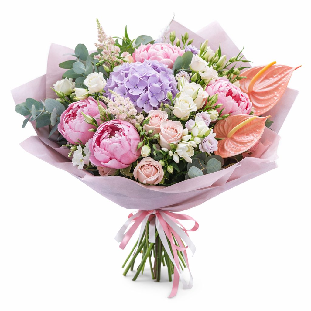 Мягкие сиреневые и розовые оттенки приносят радость и лёгкость. В букете представлены клематис, сиреневая альстромерия, астильба, сиреневая гортензия, розовая и белая кустовые розы, персиковый антуриум, розовый пион и эвкалипт. Упакован в матовую плёнку, перевязанную розовой лентой, придающей элегантность. Композиция создаёт атмосферу нежности и подойдёт на благодарность учителю.
