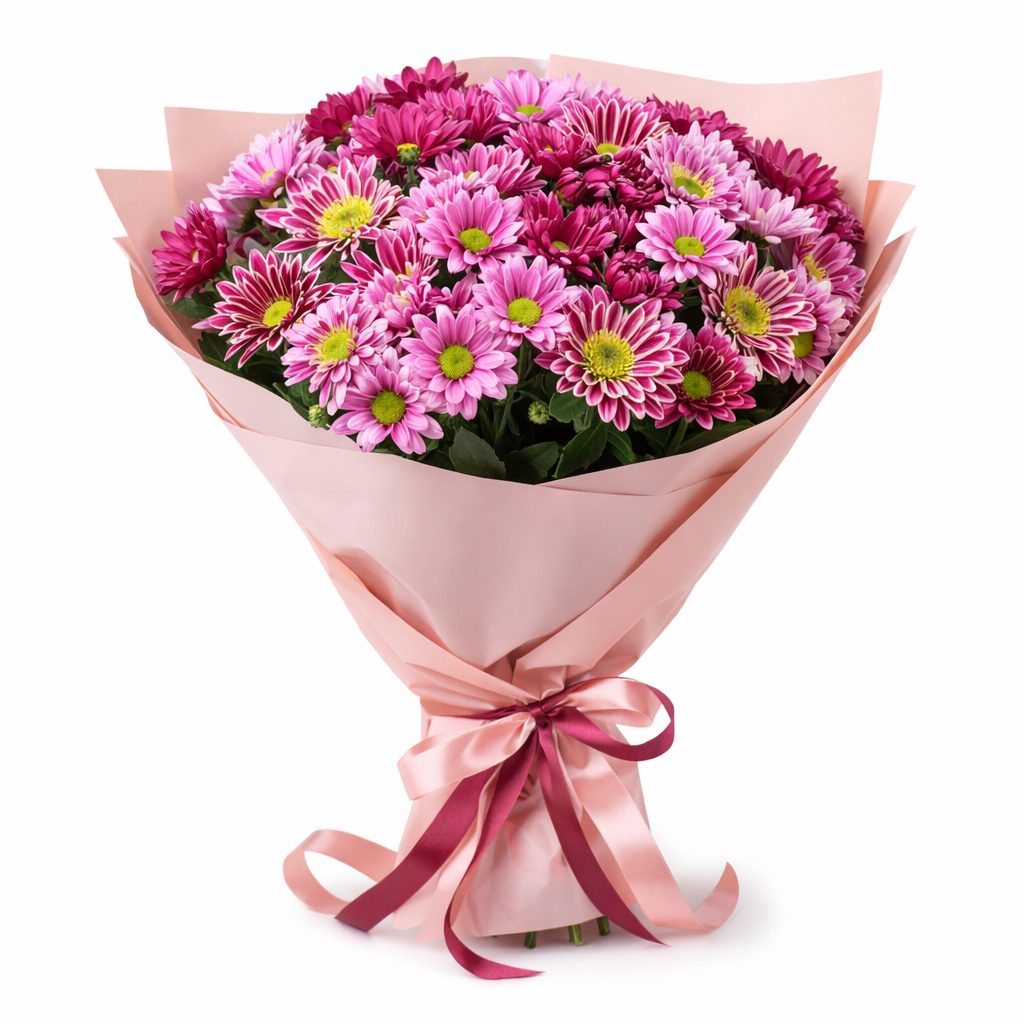 Яркий и жизнерадостный микс розовых оттенков хризантем создаёт атмосферу нежности и радости. Букет состоит из хризантем, оформленных в матовую плёнку нежно-розового цвета и перевязан атласной лентой того же оттенка. Эта композиция придаст теплоту любому пространству. Подойдёт для поздравления начальника с повышением.