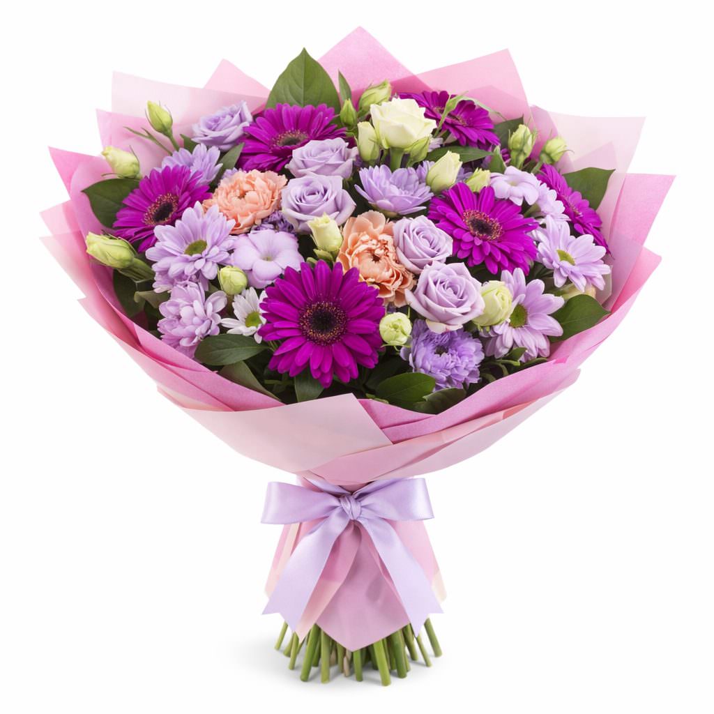 Яркие оттенки сиреневого и розового создают атмосферу нежности и радости. В букете собраны светло-сиреневая кустовая хризантема, сиреневая гербера, светло-фиолетовая эустома, розовая гвоздика и пушистый хлопок. Упакован в матовую пленку и украшен атласной лентой. Этот букет станет прекрасным подарком для мамы на день рождения и украсит любой праздник.