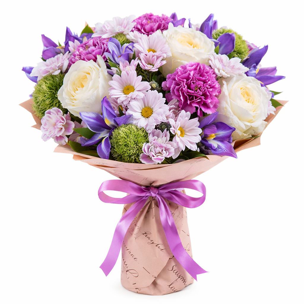 Яркие фиолетовые и розовые оттенки создают атмосферу радости и нежности. В составе букета кремовые пионовидные розы, сиреневые гвоздики, розовые кустовые хризантемы, ирисы и зелень. Упакован в крафт-бумагу с надписями и украшен сиреневой атласной лентой. Эта композиция добавит изысканности любому празднику. Отличный выбор для поздравления подруги на день рождения.