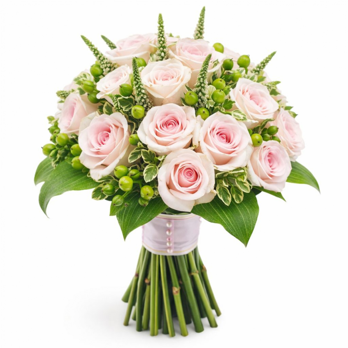 Роза одноголовая розовая, вероника, гиперикум, зелень. Упаковка (лента, пленка, крафт, сетка, пленка матовая)