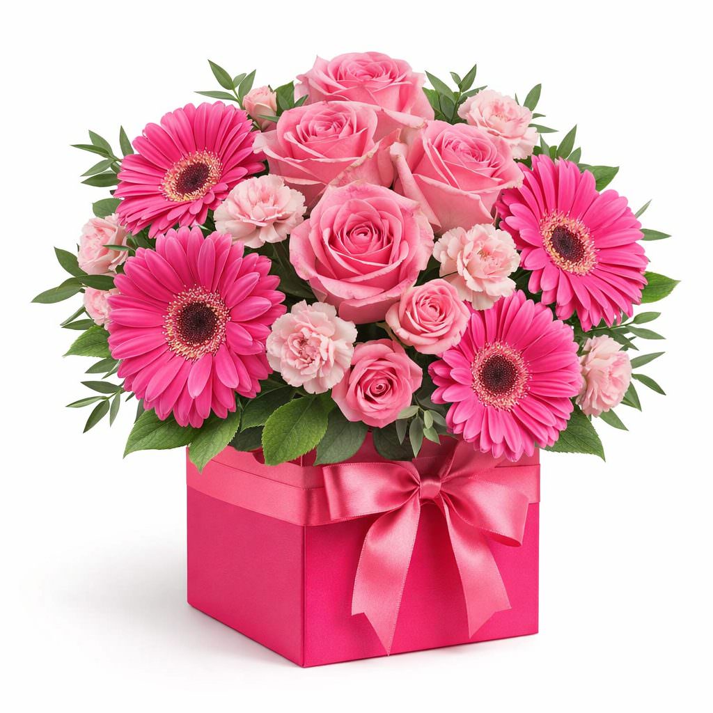 Розовая палитра этого букета вызывает чувство нежности и уюта. В составе роза одноголовая розовая, роза кустовая розовая, гербера розовая и гвоздика кустовая мини розовая, дополненные фисташкой. Упакованы цветы в яркую квадратную коробку, создающую эффектный акцент. Этот букет создаёт атмосферу романтического вечера и станет отличным подарком для любимой женщины на День святого Валентина.