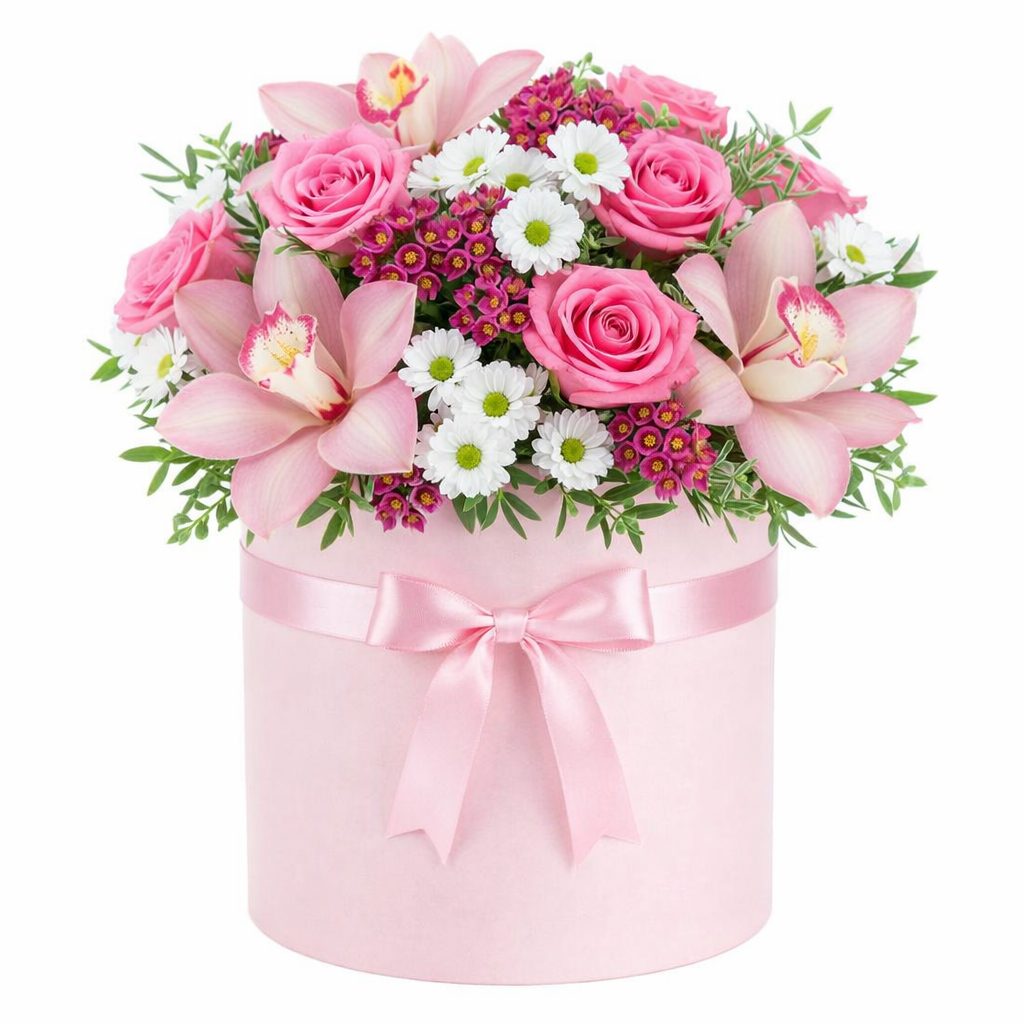 Этот букет поражает нежной палитрой розовых и белых оттенков. В композиции присутствуют розовая орхидея, одноголовая розовая роза, кустовая хризантема белая и розовая, а также фисташка. Цветы аккуратно собраны в шляпной коробке, украшенной розовой лентой. Эта композиция создает атмосферу утонченной элегантности, идеальна на золотую свадьбу для любимой женщины.