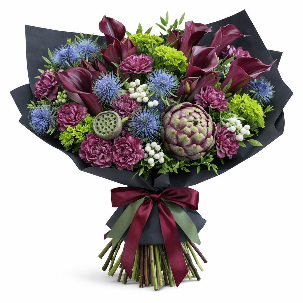 Этот букет завораживает насыщенными бордовыми и сиреневыми оттенками. В его составе бордовые каллы, сиреневые гвоздики и экзотические эрингиумы, создающие уникальную композицию. Букет оформлен в стильную чёрную крафт-бумагу и перевязан лентой. Композиция добавит элегантности любому празднику, а также прекрасно подойдёт для романтического вечера с любимой.