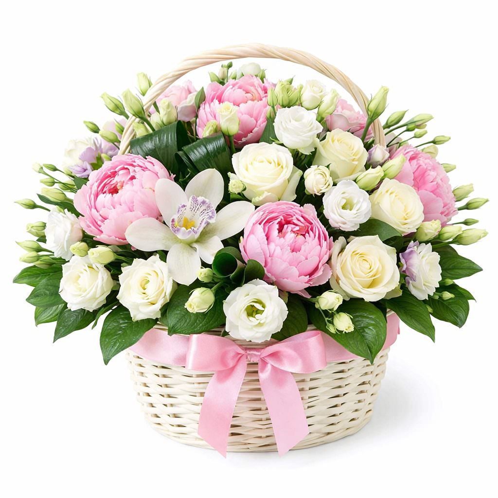 Эта нежная композиция в пастельных тонах дарит атмосферу весенней свежести. В составе пион розовый, роза кремовая, эустома белая и орхидея кремовая, дополненные зеленью аспидистры. Корзина выполнена из светлого плетения, добавляя легкость и элегантность. Идеально подойдет для поздравления мамы на День матери.