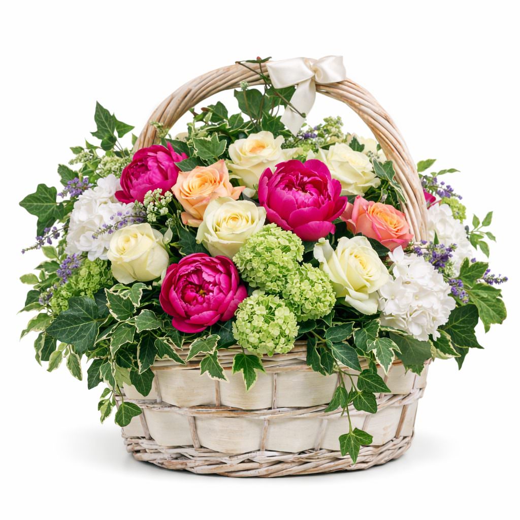 Нежная палитра белого и персикового с яркими розовыми акцентами создаёт атмосферу утончённости. В составе белые и персиковые розы, розовые пионы, белая и зелёная гортензия, а также плющ. Композиция оформлена в плетёной корзине с изящной лентой. Эта корзина дарит уют и гармонию, идеально подойдёт на день рождения для любимой женщины.