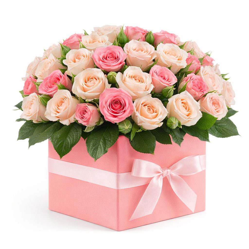 Эта композиция из кремовых и розовых кустовых роз создаёт атмосферу лёгкости и романтики. Цветы аккуратно расположены в квадратной коробке нежного розового цвета, украшенной белой лентой. Такой букет станет отличным подарком на День святого Валентина для любимой женщины. Подарите радость и нежность своим близким в этот особенный день.