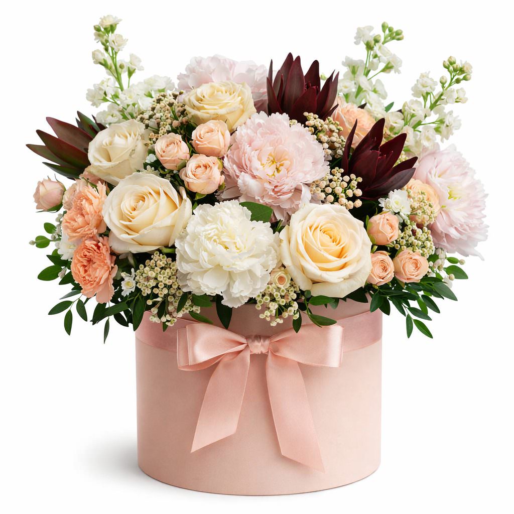 Великолепное сочетание кремовых и розовых оттенков создаёт атмосферу нежности и романтики. В составе букета — кремовая одноголовая роза, белая маттиола, хамелациум, кремовая кустовая роза, розовый пион, кремовая гвоздика, леукодендрон, фисташка и эвкалипт. Композиция представлена в элегантной шляпной коробке нежного розового цвета. Этот букет станет отличным подарком для жены на день рождения, создавая атмосферу праздника и радости.