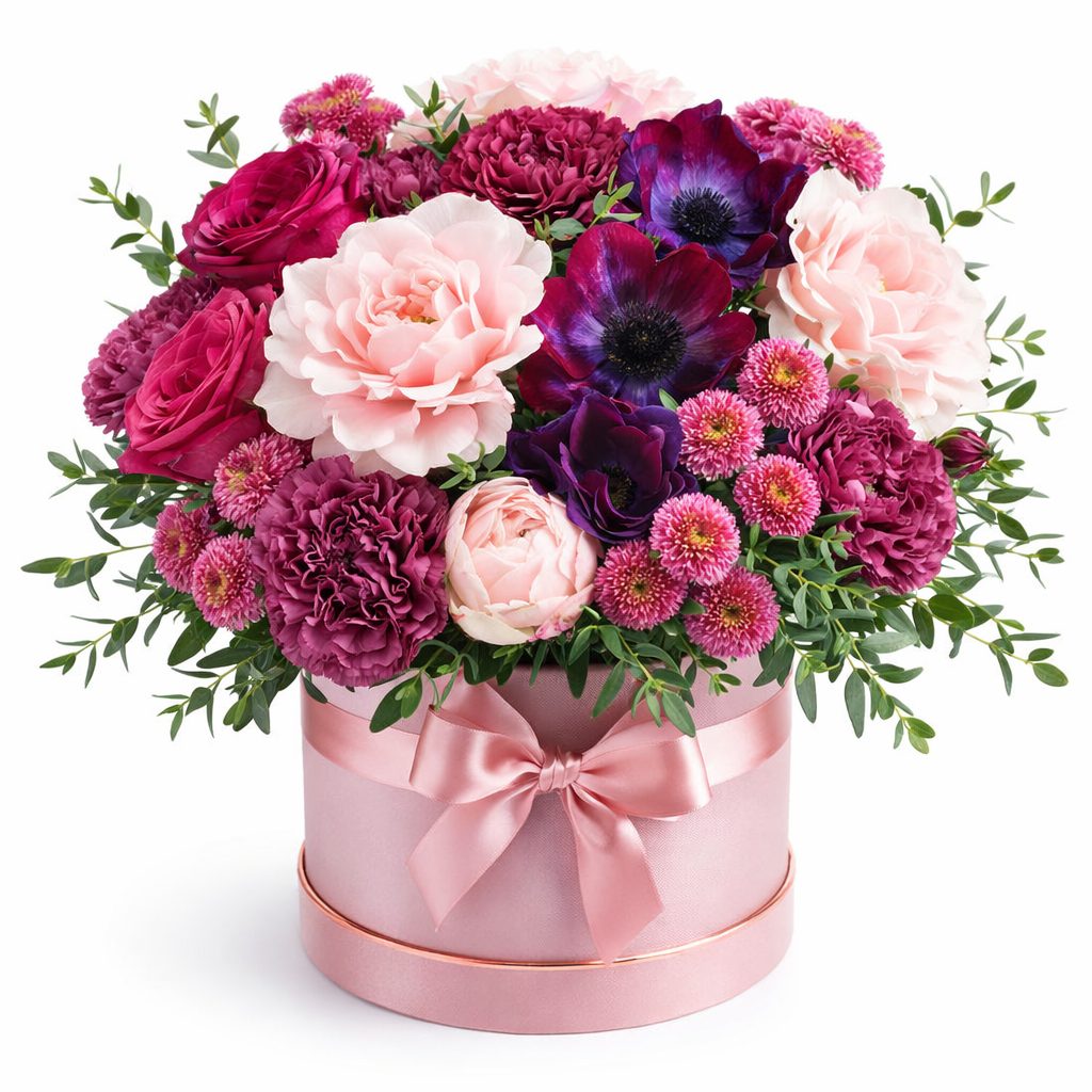 Эта цветочная композиция создает атмосферу нежности благодаря розовым и сиреневым оттенкам. В составе роза одноголовая розовая, гвоздика сиреневая, анемон бордо, хризантема кустовая розовая и эвкалипт. Цветы собраны в стильную круглую шляпную коробку, подчеркивая их утонченную красоту. Идеально подойдет для романтического вечера, чтобы порадовать любимую женщину.