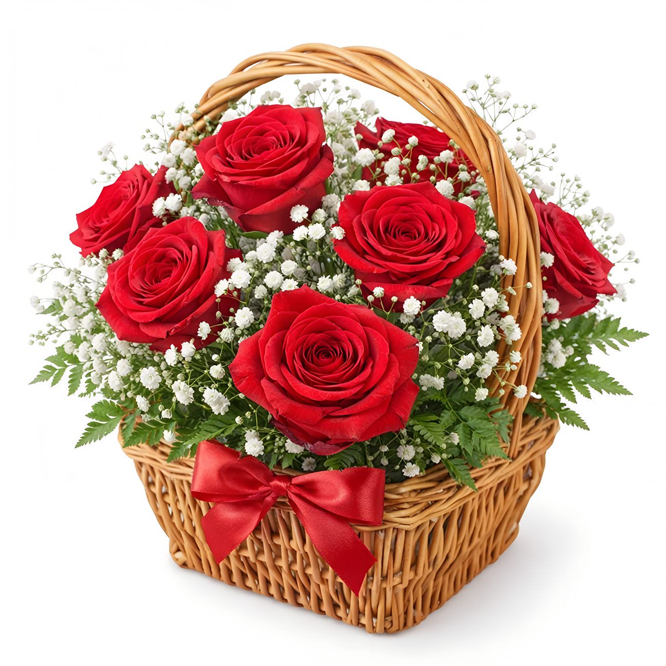 Яркие красные розы в сочетании с нежной гипсофилой и зеленью создают атмосферу страсти и утонченности. В составе композиции: роза одноголовая красная, гипсофила и зелень. Корзина плетёная, натурального цвета, добавляет природного шарма. Эта композиция подарит романтическое настроение для любимого мужчины на годовщину.