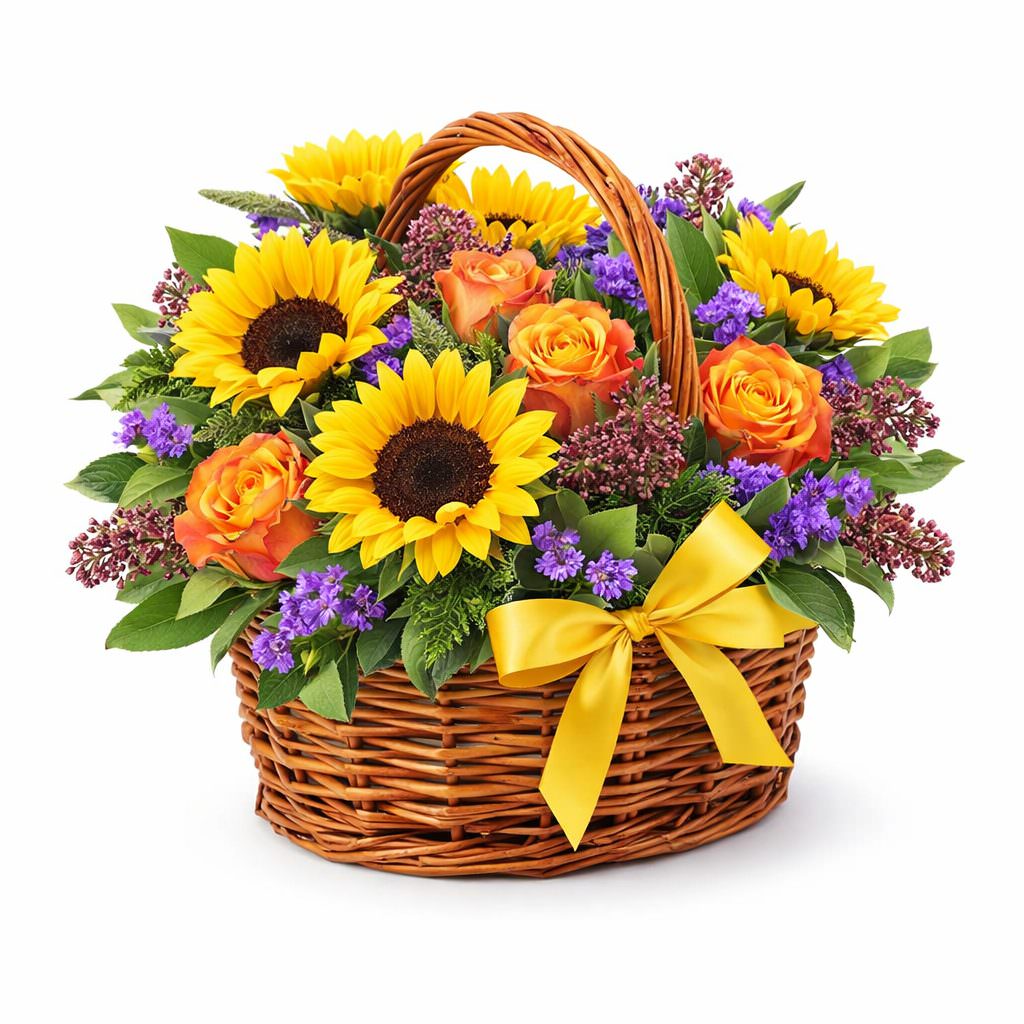 Корзина с живыми цветами «Солнечный привет» с гарантией качества, цены и быстрой доставки!