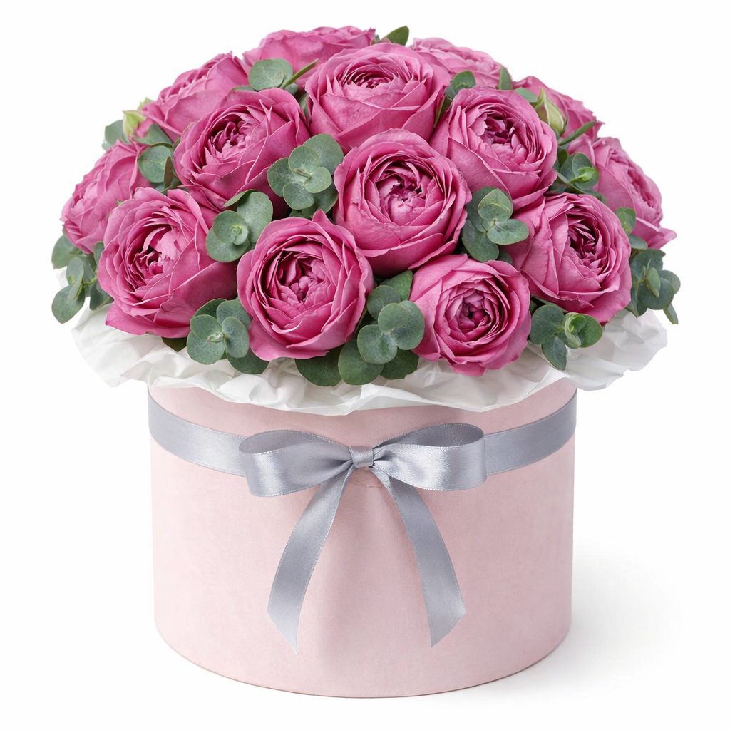 Эта композиция из роз пионовидной Misty bubbles и эвкалипта погружает в мир нежных розовых оттенков. Шикарные розы и эвкалипт великолепно гармонируют в шляпной коробке нежного розового цвета, украшенной серебристой лентой. Композиция создаёт атмосферу утончённой элегантности, идеально подходя для романтического вечера. Прекрасный выбор для возлюбленного на День Святого Валентина.