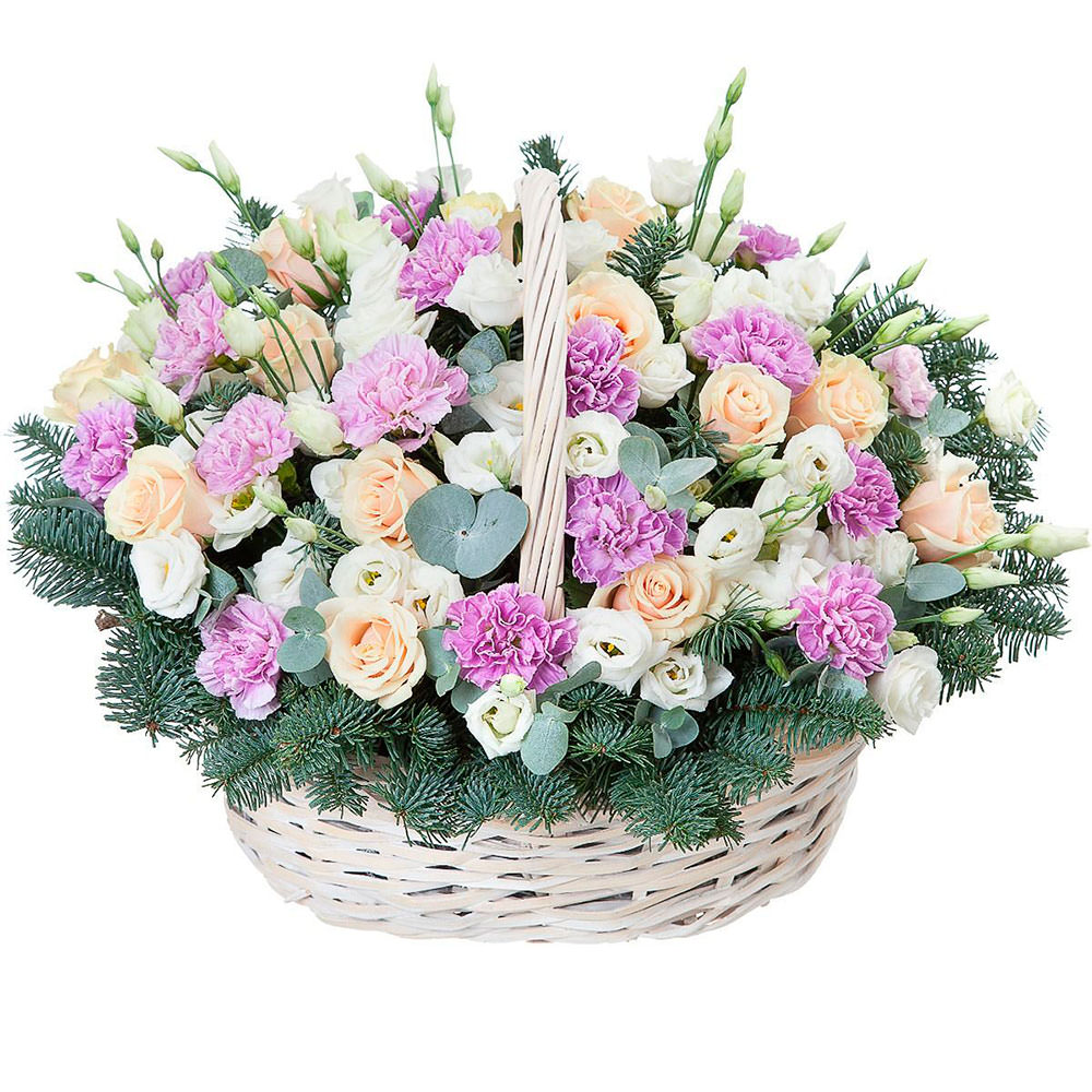 Эта композиция в нежных белых, сиреневых и кремовых тонах пробуждает чувство радости и гармонии. В корзине представлены белая эустома, сиреневая гвоздика, кремовая кустовая роза и нобилис. Плетёная корзина добавляет естественность и изящество. Она создаёт атмосферу уюта и подходит для поздравления начальницы на День города.