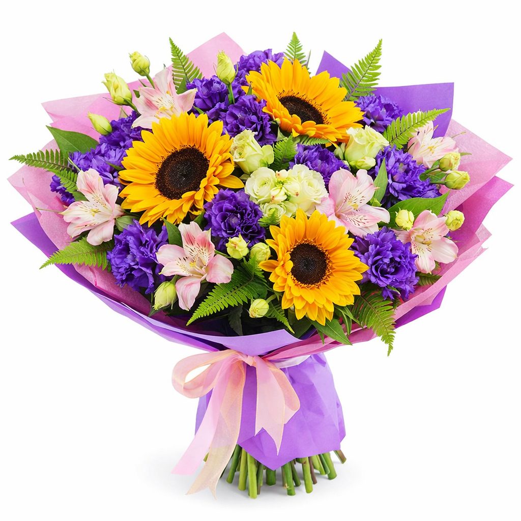 Яркие и насыщенные цвета этого букета вызывают радость и вдохновение. В его составе подсолнух, фиолетовая эустома, розовая альстромерия, зеленая кустовая хризантема и аспарагус. Упаковка выполнена из матовой пленки и крафт-бумаги с добавлением сетки, дополнена нежной лентой. Этот букет создаёт атмосферу весеннего праздника и идеально подойдёт для поздравления любимой на День влюблённых.