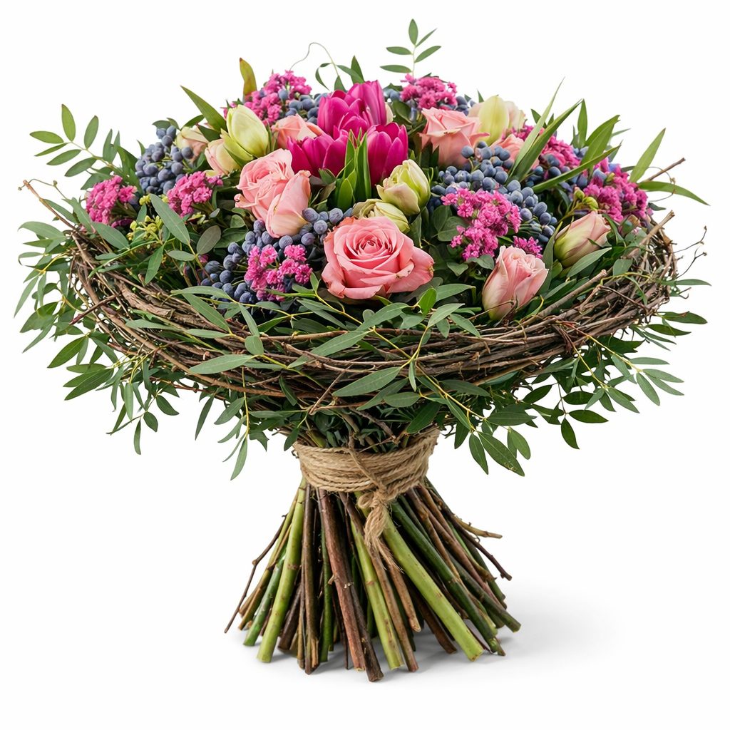 Этот букет из розовых и белых цветов наполняет атмосферу нежностью и свежестью. В составе розовая кустовая роза, белая и розовая фрезия, розовый тюльпан и розовая статица, дополненные фисташкой и зеленью. Букет оформлен в каркасе, который придаёт ему природное обаяние. Идеально подходит для встречи из поездки и порадует любимую женщину.