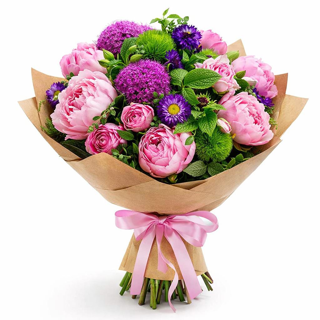 Погрузитесь в атмосферу свежести и нежности благодаря розовым пионам и кустовым розам, дополненным экзотической зеленью. Букет оформлен в матовую плёнку и украшен розовой атласной лентой, создающей гармоничный образ. Элегантная композиция дарит чувство весеннего обновления. Идеально для поздравления начальника с повышением.