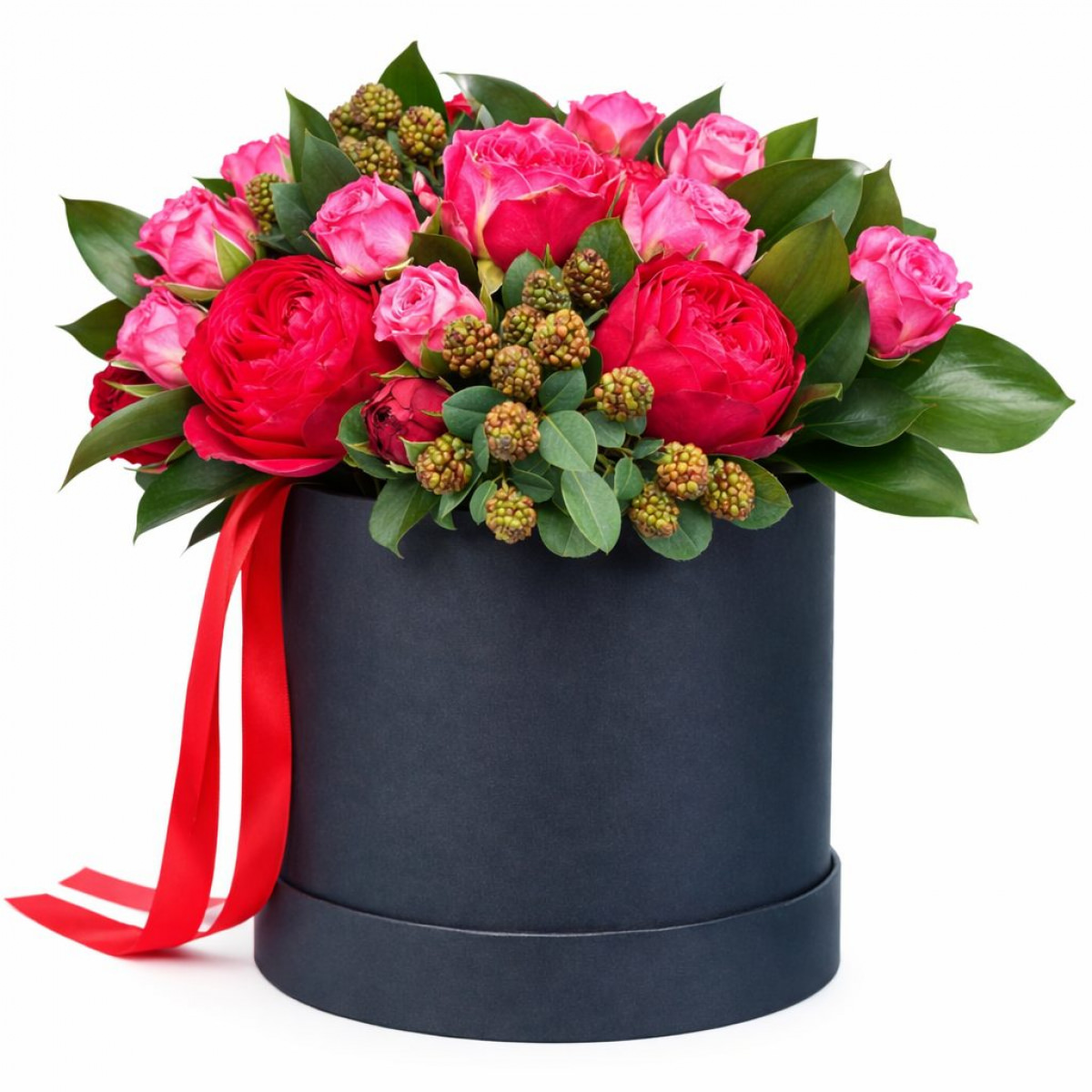 Эта композиция завораживает своим контрастом красных и розовых оттенков. В составе пионовидные красные розы, розовые кустовые розы, аспидистра и куст ежевики. Упакованы цветы в стильную чёрную шляпную коробку с красной лентой. Прекрасно подойдёт для романтического вечера, чтобы удивить любимую женщину.