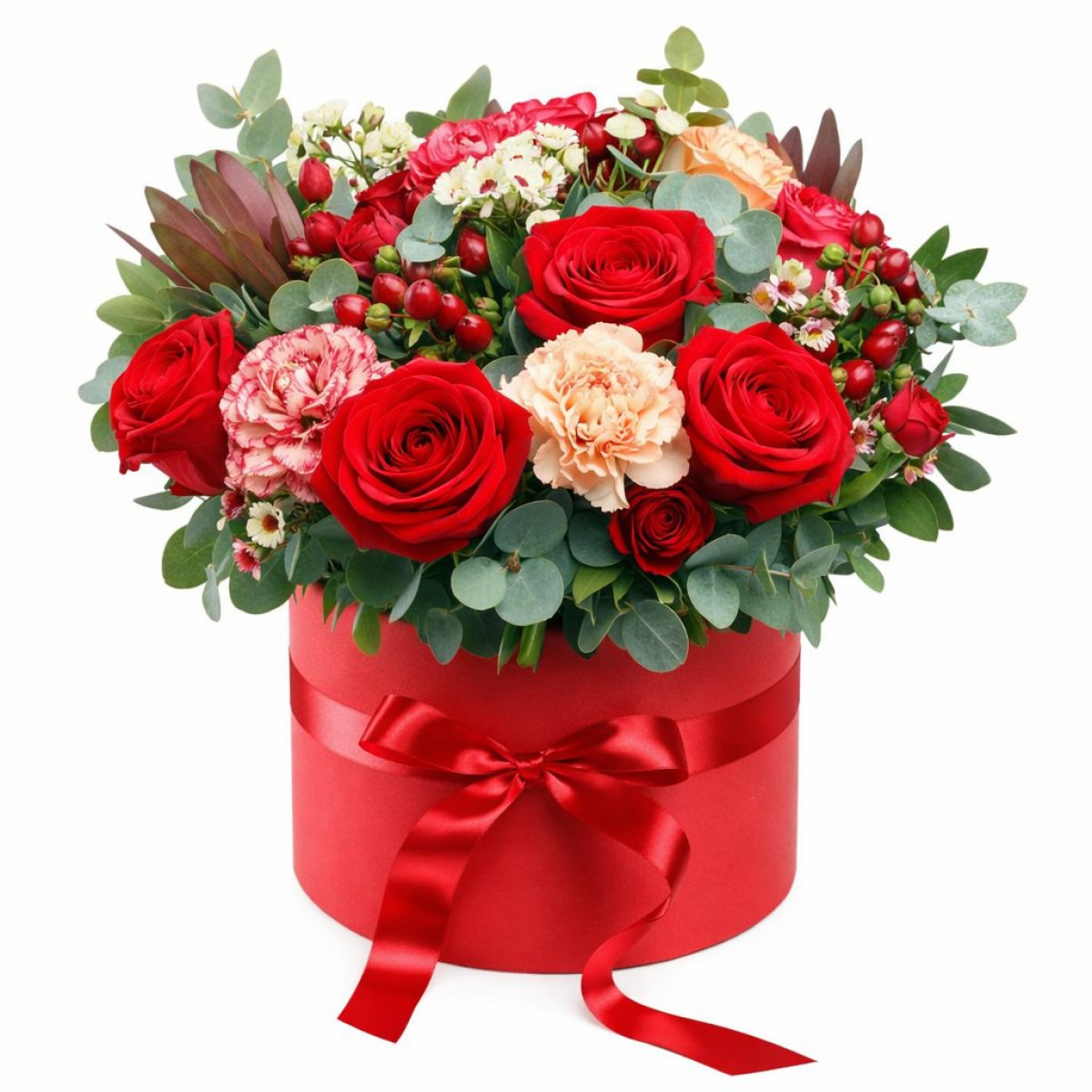 Эта яркая композиция в красно-розовых тонах наполняет атмосферу романтикой и теплом. В её составе: красная одноголовая роза, кустовая роза, розовая и кремовая гвоздика, протея, ваксфлауэр, гиперикум и эвкалипт. Шляпная коробка красного цвета украшена атласной лентой. Такой подарок создаст уют и станет отличным подарком для классного руководителя на новый год.