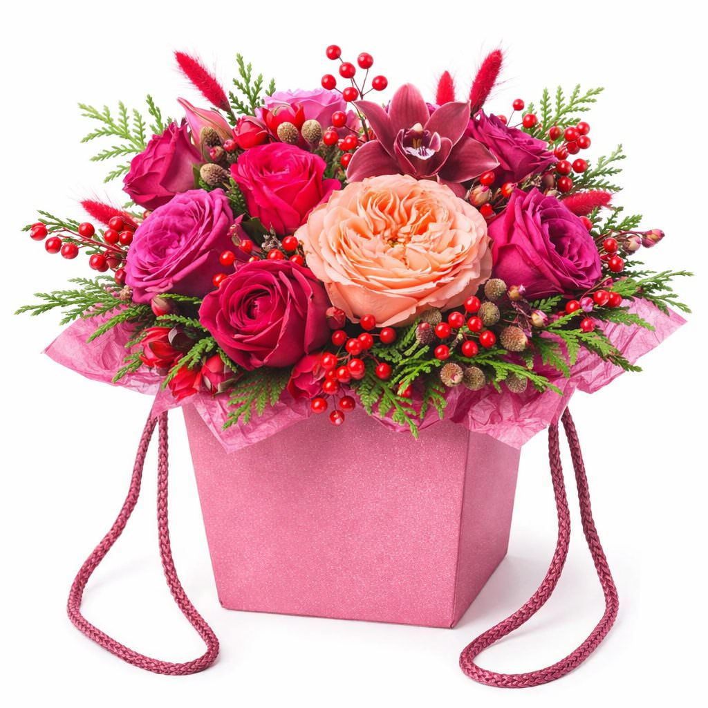 Яркий контраст коралловых и розовых оттенков создаёт атмосферу нежности и элегантности. В составе композиции — пионовидная коралловая роза, розовая одноголовая роза, тёмно-розовая орхидея, миниатюрная розовая кустовая гвоздика, а также туя, илекс, бруния и декоративные перья. Упакована в стильную квадратную коробку с ручками, выполненную в розовых тонах. Идеально подойдёт для поздравления любимой женщины на День влюблённых.