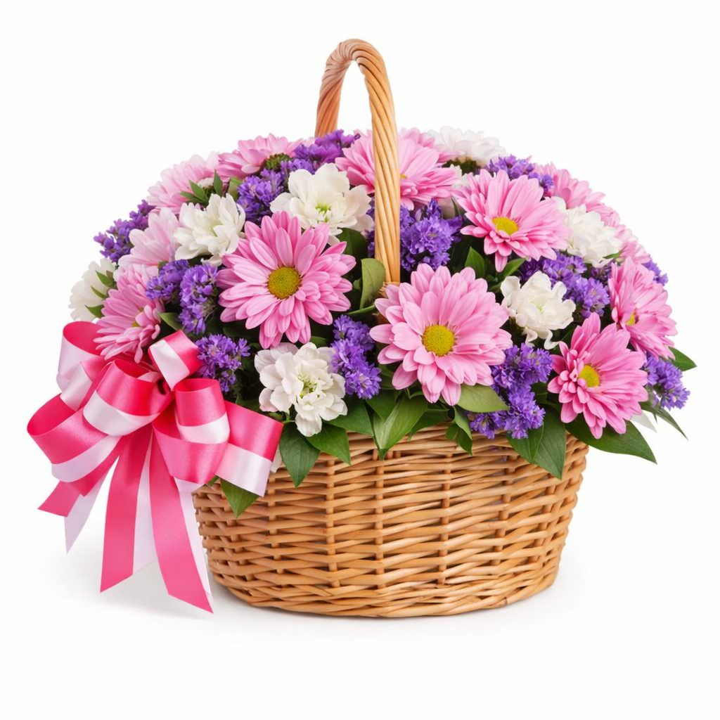 Эта корзина излучает радость благодаря нежной розовой и белой хризантеме, дополненной фиолетовой статицей. Плетёная корзина с натуральным узором и яркой лентой придаёт ей изысканность. Композиция создаёт атмосферу праздника и романтики, идеально подходящую для новоселья. Порадует любимую женщину своими яркими красками и свежестью.