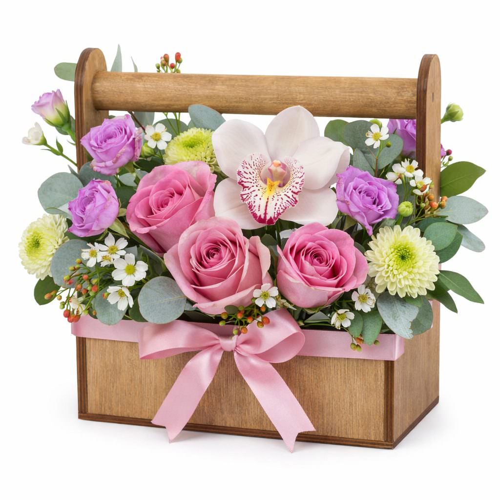 Нежная палитра розовых, белых и сиреневых оттенков создаёт атмосферу утончённости. В состав входят белая орхидея, розовая роза, сиреневая гвоздика, белая и зелёная кустовая хризантема, ваксфлауэр, гиперикум и эвкалипт. Композиция оформлена в стильном дешевянном ящике с ручкой. Идеально подойдёт для поздравления коллеги на повышение, радость для любимой женщины.